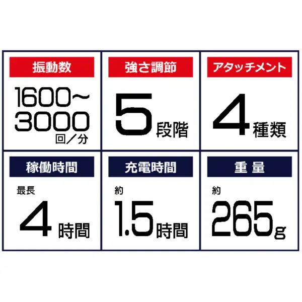 付属品 アタッチメント×4種類 ・アタッチメント用ストッパーゴム(予備)×1 ・充電用USBコード ×1 ・取扱説明書 ×1 ・収納ケース ×1