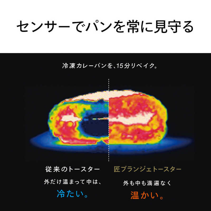 ●目指したのは、パン本来の“焼きたて”でした。外は、カリカリ。中は、しっとり。ベーカリーの焼きたてがおいしい理由は、外側と中身の絶妙な温度バランスにありました。「匠ブランジェトースター」は精密な「庫内温度センシング」 × 「遠近2種類のヒーター制御」で、まるで匠が丁寧に焼き上げたようなおいしさを実現しました。