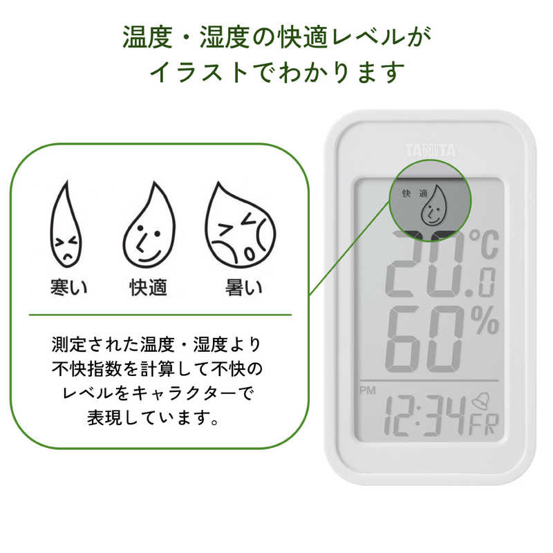 おしゃれなカラーマグネット、フック穴付き(測定範囲)温度5.0~50.0°(5.0°未満の時、「Lo」、95%を超えると「Hi」)(測定温度)温度0.0~40.0°±1.0°、それ以外±2.0°、湿度35~75% ±5%それ以外±10%(最小)温度0.1°単位、湿度1%単位(表示周期)約20秒に1回(機能)カレンダー表示(日付・曜日)時計表示(12時間・24時間切替)最高・最低温湿度表示