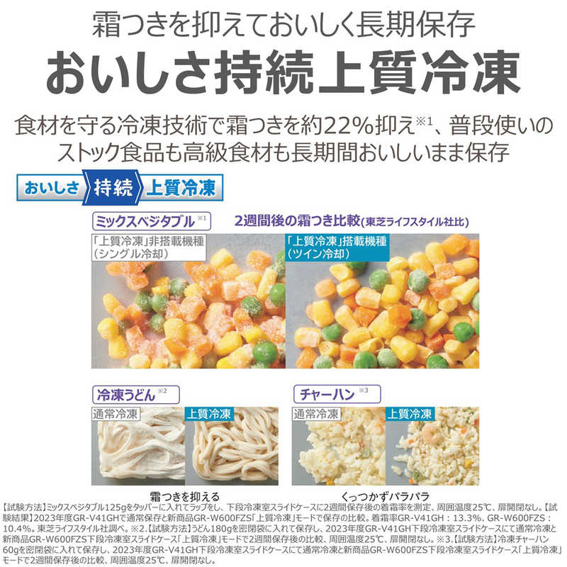 東芝独自のツイン冷却システムで、温度変動を抑えて乾燥や霜付きを防いで食感やうまみ成分をキープ。