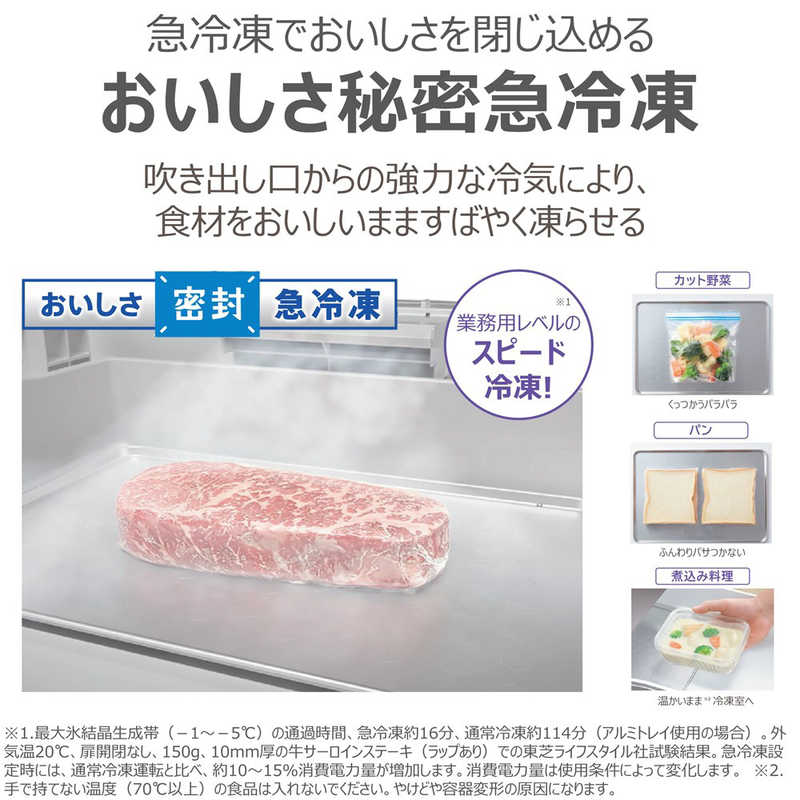 ・「速鮮チルド」東芝独自のツイン冷却により、食品が凍らない-4℃前後の高湿度冷気を送り込み、買い物後に温度が上がった食材を急速に冷やし、鮮度が落ちるのを防ぎます。