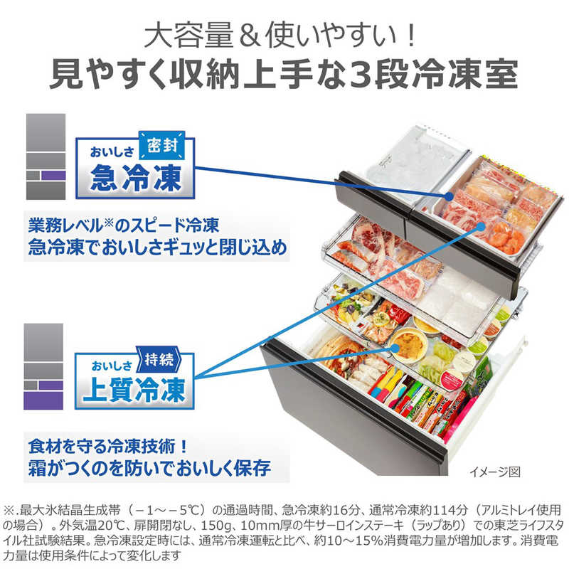 ・「速鮮チルド」東芝の特許技術ツイン冷却により、食品が凍らない-4℃前後の高湿度冷気を送り込み、買い物後に温度が上がった食材を急速に冷やし、鮮度が落ちるのを防ぎます。
