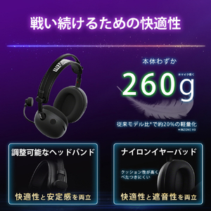 わずか 260g (*1) の軽量設計で頭部への負担を低減。さらに、最適化された側圧やヘッドバンドの重さを感じさせない独自構造により、長時間プレイでも快適な設計を実現しました。加えて1日中プレイ可能な最大30時間 (*2) のバッテリーを搭載し、戦い続けるプレイヤーをサポートします。