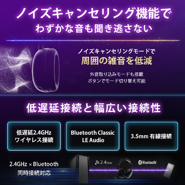 ●ワイヤレス接続:2.4GHzワイヤレス接続/Bluetooth Classic/Bluetooth LE Audio/3.5mm有線接続