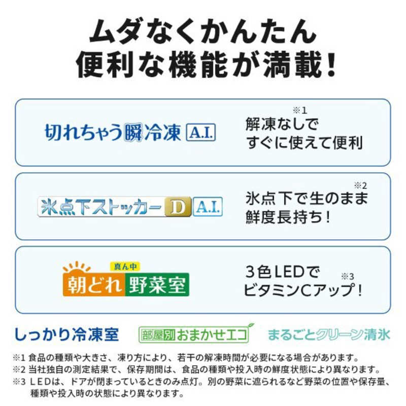 ●冷凍のお悩みを解決!切れちゃう瞬冷凍A.I.は、肉も魚もそして野菜もおいしく冷凍でき、更に冷凍なのにサクッと切れて解凍いらず!すぐ調理に使えます。