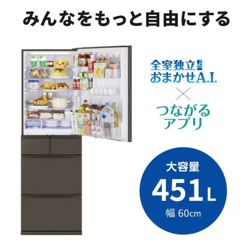 三菱 MITSUBISHI 451L 5ドアノンフロン冷蔵庫 MDシリーズ アプリ対応 MDシリーズ 右開き フラットアンバーグレー MR-MD45N-H(大型)