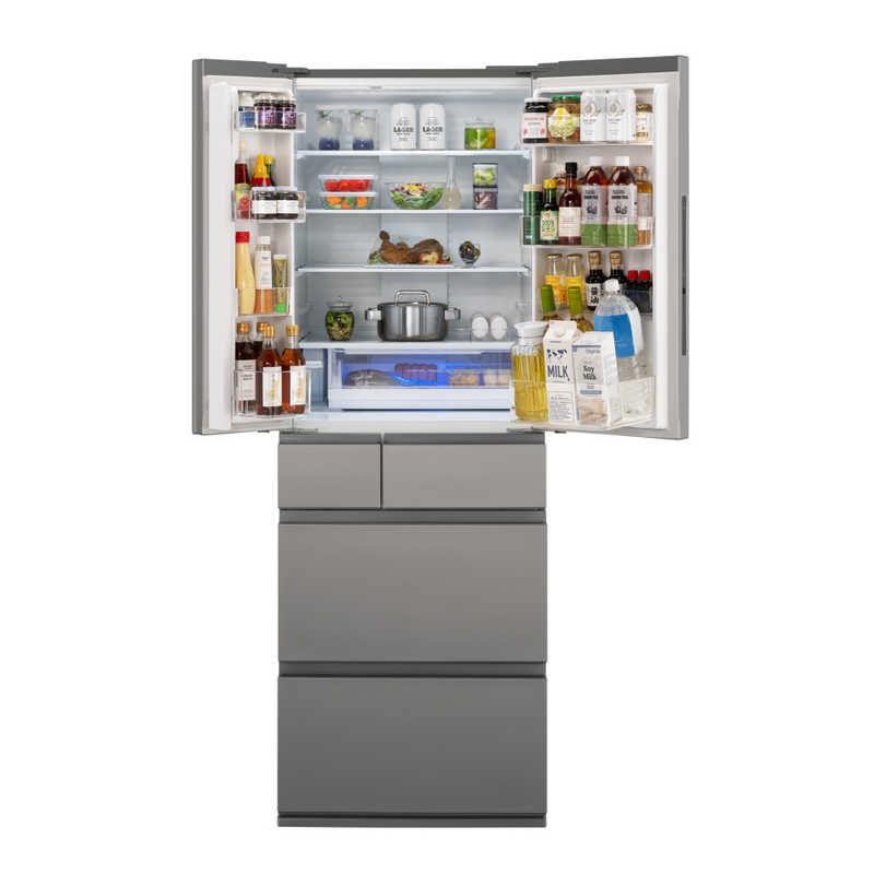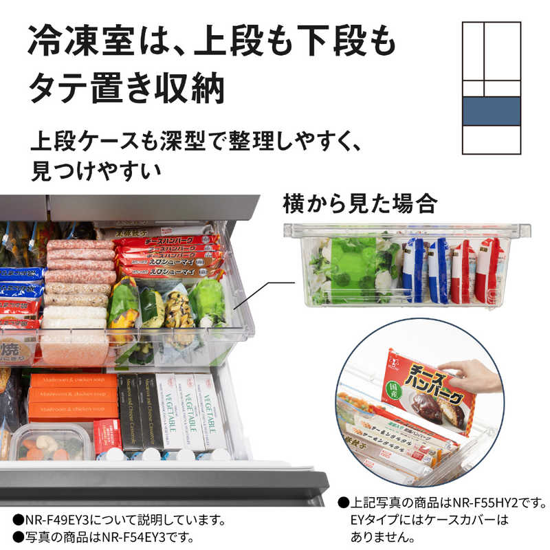 ●たっぷり収納できる大容量なのに整理しやすく、使いやすい・霜つき抑制冷凍、冷凍食品の霜つきを抑える。(※冷凍室下段)冷凍室の食品を約2週間後も約27%霜つきを抑制。