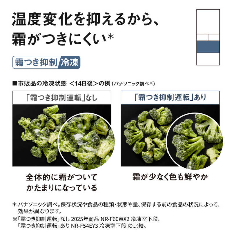 ●たっぷり収納できる大容量なのに整理しやすく、使いやすい・霜つき抑制冷凍、冷凍食品の霜つきを抑える。(※冷凍室下段)冷凍室の食品を約2週間後も約27%霜つきを抑制。