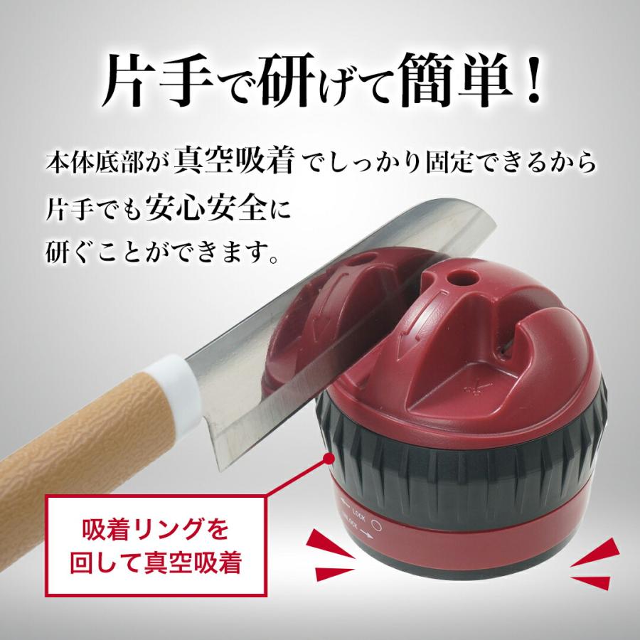 ●本体底部が真空吸着でしっかり固定できるから、片手でも安心安全に研ぐことができます。