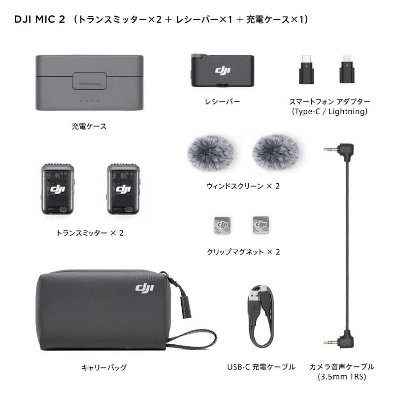 ■製品内容 DJIMic2(2TX+1RX+充電ケース)、DJIMic2レシーバー×1、DJIMic2トランスミッター(シャドーブラック)×2、DJIMic2充電ケース×1、DJIMic2カメラ音声ケーブル(3.5mmTRS)×1、DJIMic2スマートフォンアダプター(Type-C)×1、DJIMic2スマートフォンアダプター(Lightning)×1、DJIMic2ウィンドスクリーン×2、DJIMic2クリップマグネット×2、充電ケーブル×1、DJIMic2キャリーバッグ×1