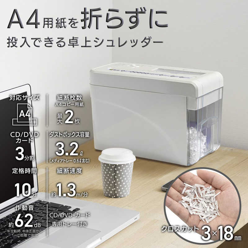 ● 最大細断枚数:紙…A4コピー用紙(64g/m2)2枚、CD/DVD・カード…1枚