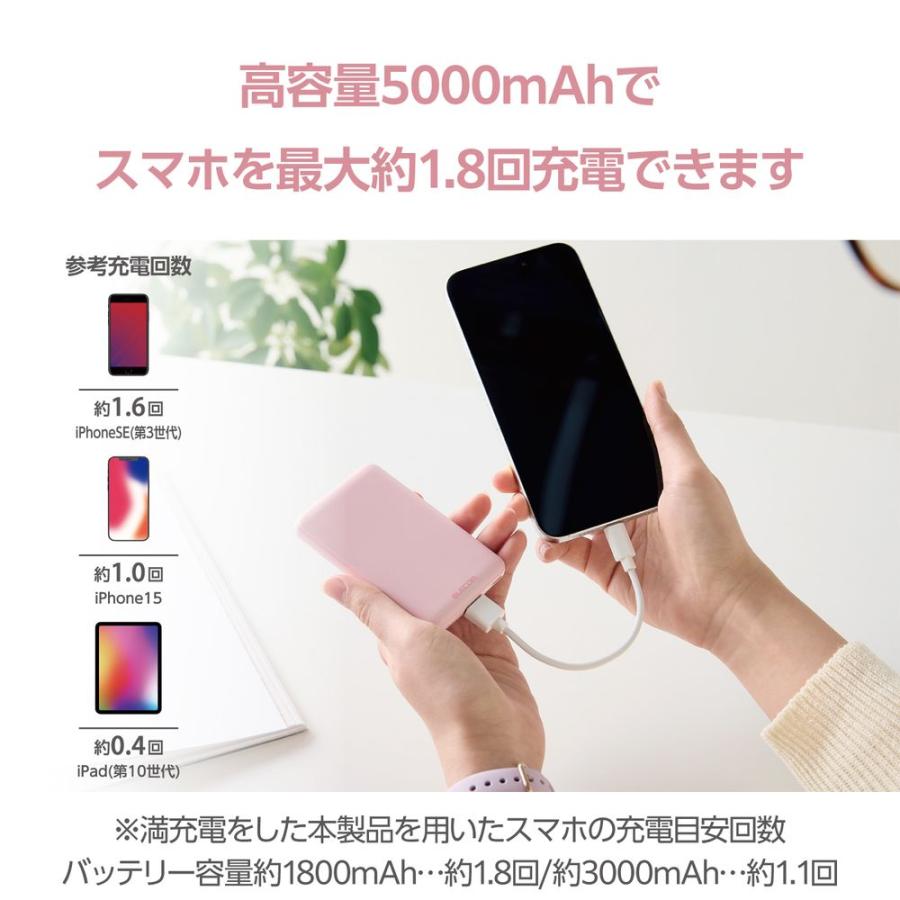 ●本製品(バッテリー容量5000mAh)で、1800mAhのスマートフォンを約1.8回、3000mAhのスマートフォンを約1.1回充電可能です。