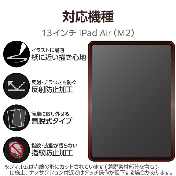 動画視聴の際などに取り外して使える、13インチiPad Air(M2)用着脱式、紙心地フィルム、指紋防止、反射防止タイプです。