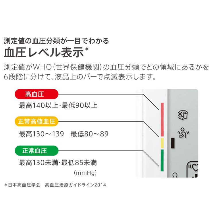 ●測定値の血圧分類が見える血圧レベル表示。正確測定に役立つ不規則脈チェック。