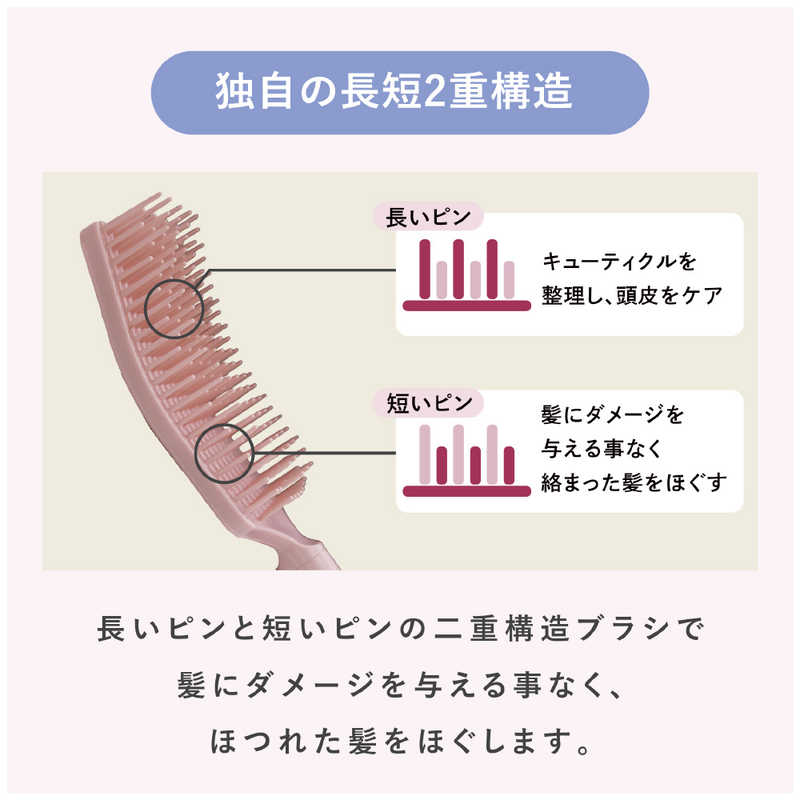 ・長いピンでキューティクルを整理し、短いピンで髪にダメージを与えることなく絡まった髪をほぐします。