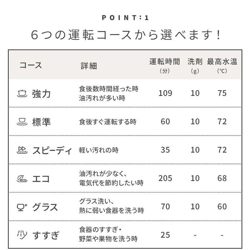 ・6つの運転コースから選べます! 「強力」「標準」「スピーディ」「エコ」「グラス」「すすぎ」