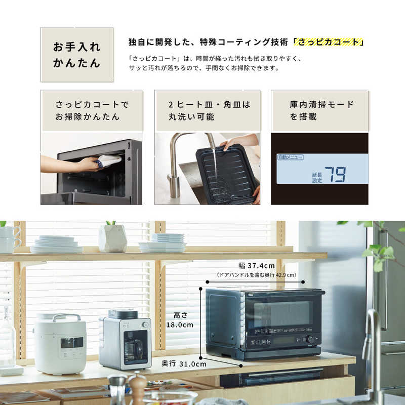 ・一般的なコーティングに比べて、付着した液体の接触角を広く保てるシロカ独自のコーティングでお手入れも簡単に。