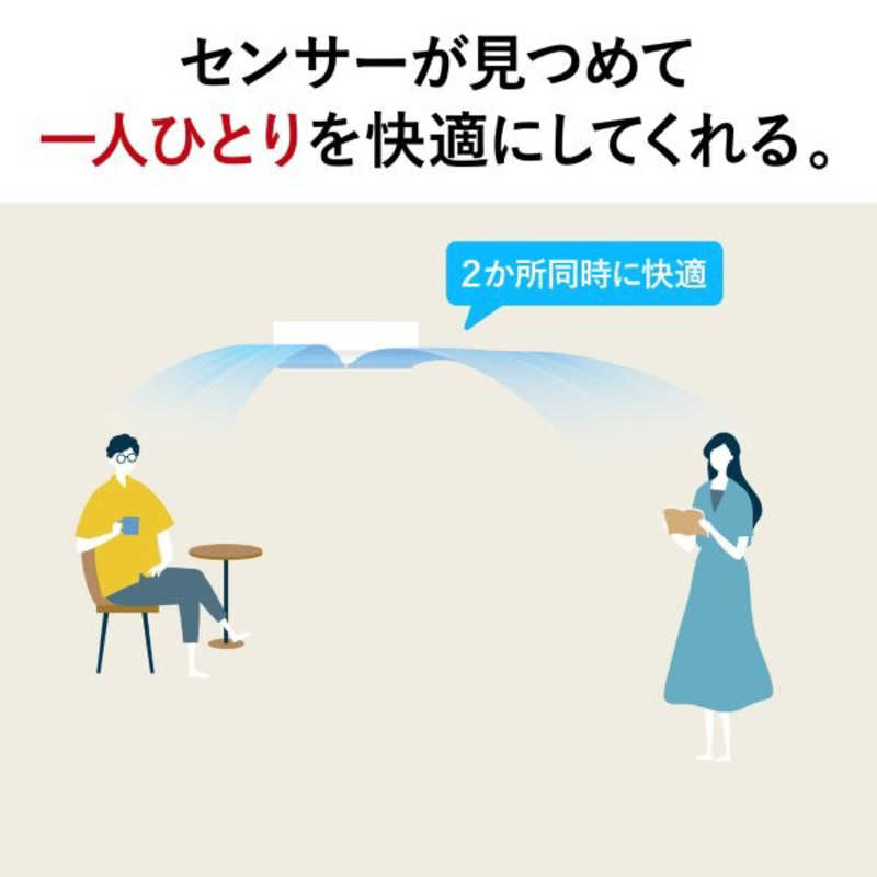 ・2か所同時空調:センサーが人を見つめて、人のいる場所を中心に気流をお届け。