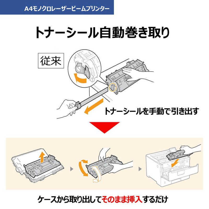 ●同梱物:本体、トナーカートリッジ056L、設置ガイド「はじめにお読みください」、保証登録のお願い、コールセンターシール、電源コード(アース線付き)、ユーザーソフトウェアCD-ROM(プリンタードライバー)