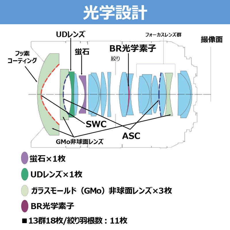 ●適所に特殊コーティング「ASC(Air Sphere Coating)」や「SWC(Subwavelength Structure Coating)」を採用することで、レンズ内の光の反射が撮影画像に入り込んでしまうフレア・ゴーストの発生を低減。