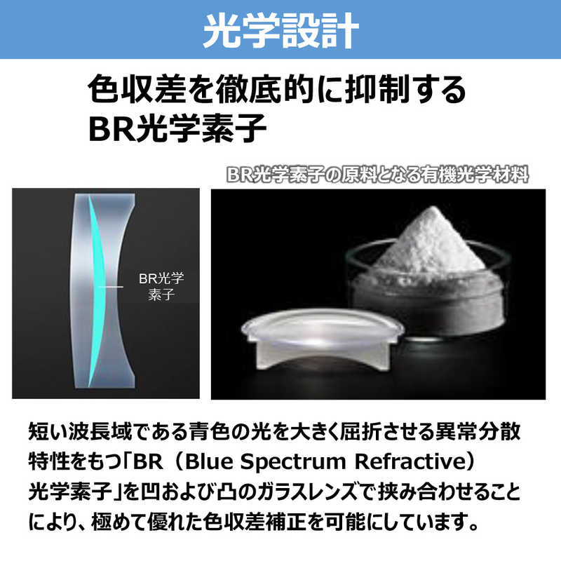 ●レンズ最前面に油や水滴が付着しにくいフッ素コーティングを採用。レンズに付着した油分なども溶剤を使わずに乾いた布などで簡単に取り除くことが可能。