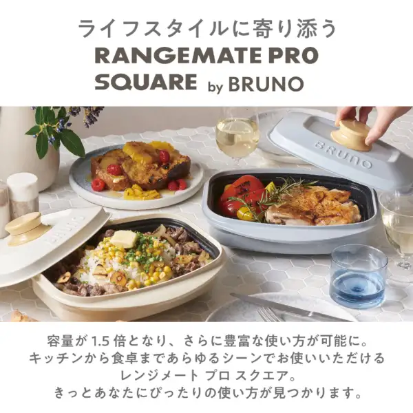 シリーズ累計世界出荷台数600万台突破した電子レンジ専用調理器具RANGEMATE PROと、ライフスタイルブランドBRUNOがデザイン監修した、第二弾コラボレーション商品「RANGEMATE PRO SQUARE by BRUNO」