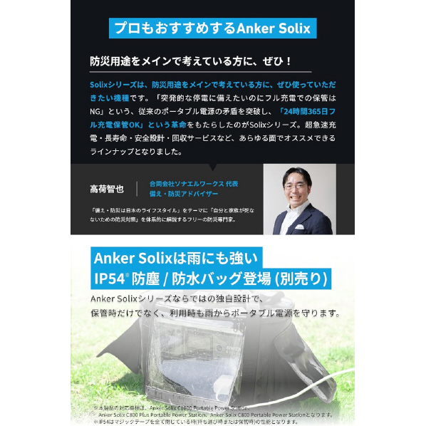 ●パッケージ内容:Anker Solix C800 Portable Power Station、AC充電ケーブル、シガーソケット充電ケーブル、安全マニュアル、18ヶ月保証 + 42ヶ月 (Ankerで会員登録後) 、カスタマーサポート