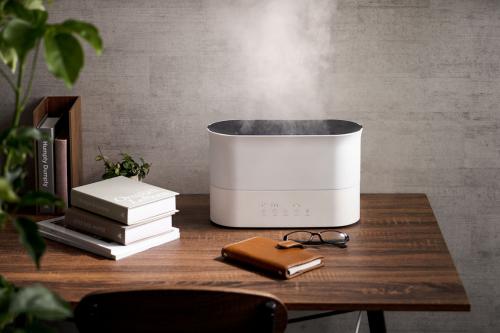 LEDライトと横長の吹き出し出口からのワイドミストによって炎の“揺らぎ”を演出するハイブリット加湿器「ルミナ」。