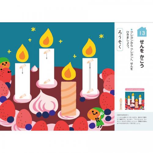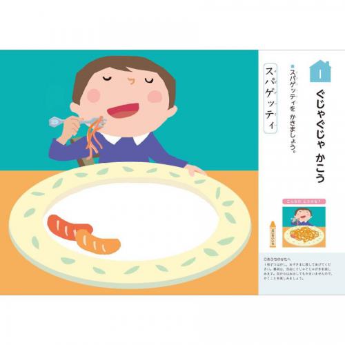 クレヨンの持ち方、使い方を身につけます。ぐじゃぐじゃ書きから少しずつステップアップする練習で、クレヨンで遊びながら手先の力をはぐくみます。