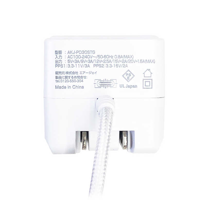 エアージェイ air-j PD30W対応 TYPE-C直付けストロングケーブル AC充電器(1.5m) ホワイト AKJ-PD30STG WH