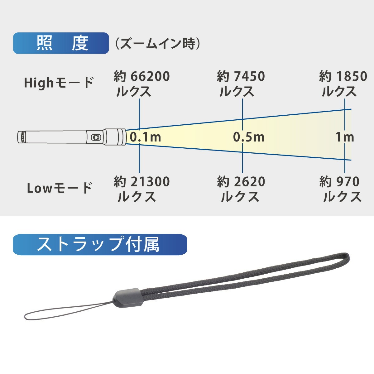 ・ ≪0.5m≫Highモード…約7450ルクス、Lowモード…約2620ルクス