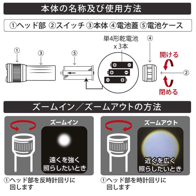 ● 光束及び連続点灯時間: ※未使用・新品のアルカリ乾電池使用時・ Lowモード…光束(明るさ)/約120 lm、連続使用時間/約12時間・ Highモード…光束(明るさ)/約450 lm、連続使用時間/約4時間