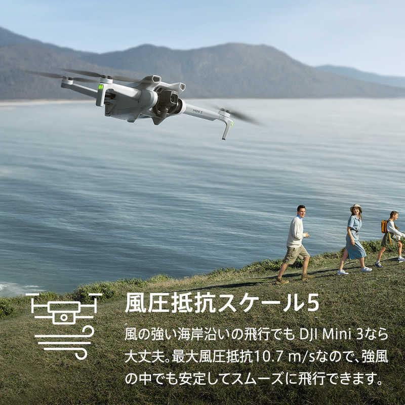 ** 制御された環境下にて、DJI Mini 3の製品版モデルを使ってテストしています。実際の使用体験は、周辺環境、使用方法、ファームウェアのバージョンによって、異なる場合があります。