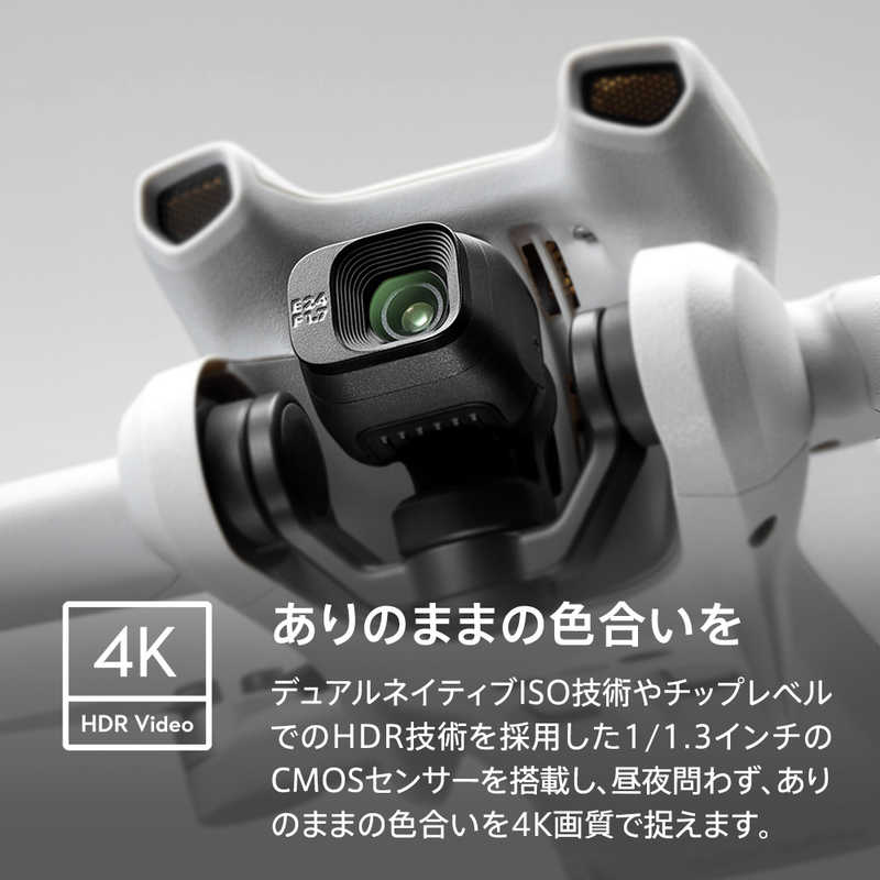 4K HDR動画を撮影できるので、昼夜問わず、ありのままの色合いを捉えます。[3] DJI Mini 3のカメラは、デュアルネイティブISO技術やチップレベルでのHDR技術を採用した1/1.3インチのCMOSセンサーを搭載しています。