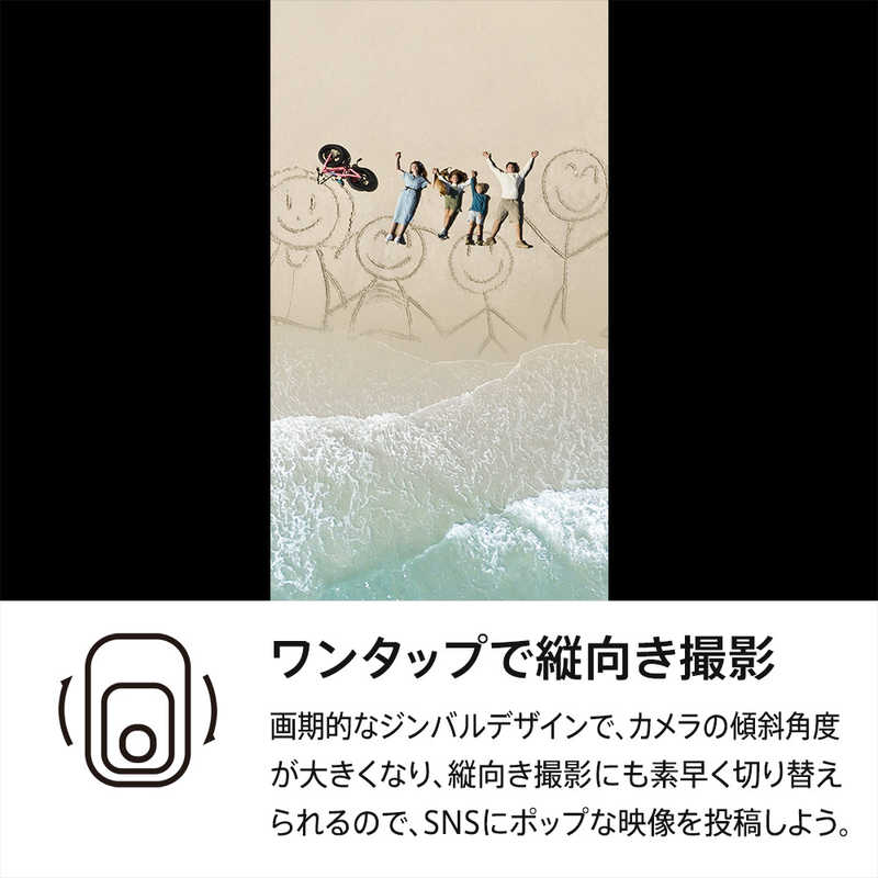 背の高い樹木や高層ビルを撮影する時でも、対象をすべてフレームに収めて、インパクトのある映像を撮影しましょう。画期的なジンバルデザインで、カメラの傾斜角度が大きくなり、縦向き撮影にも素早く切り替えられるので、SNSに投稿したくなるようなポップな映像を簡単に撮影できます。