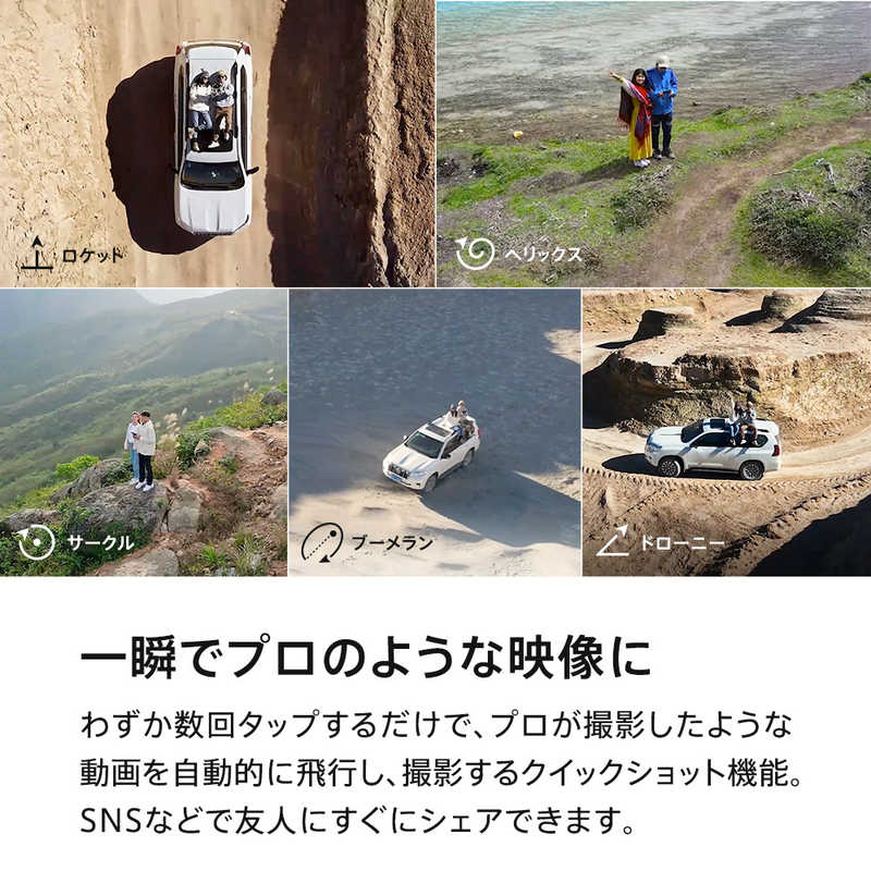 クイックショット機能を使えば、タップ操作だけで、ドローニー、サークル、ヘリックス、ロケット、ブーメランといった様々なパターンで自動飛行させ、高度な技術を要する映像を簡単に撮影できます。