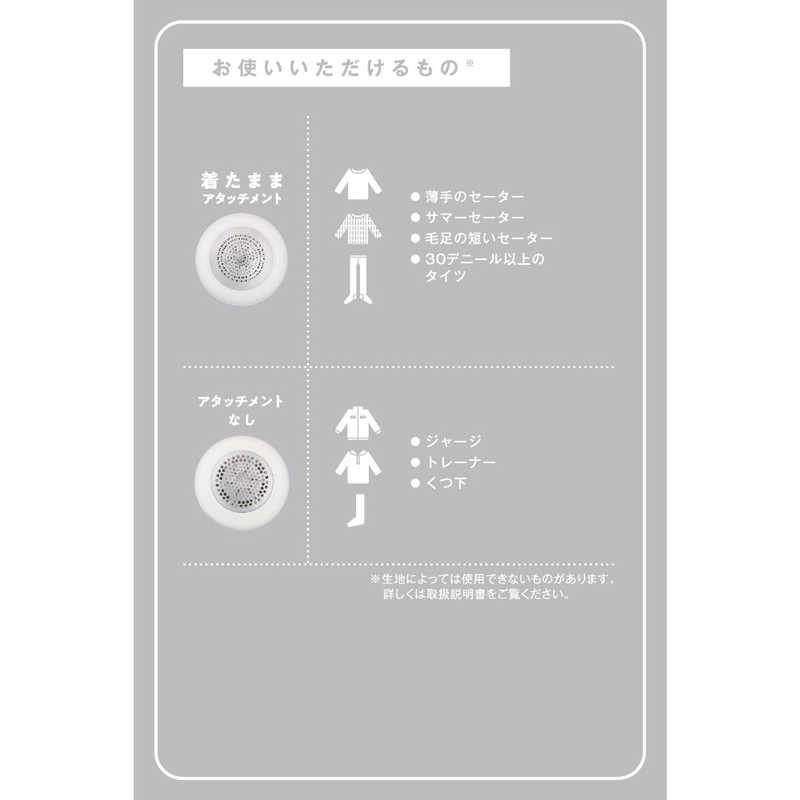 ●気付いたときに服を着たまま毛玉を取れる、着たままアタッチメントを付属しています。薄手・毛足の短いセーター、30デニール以上のタイツなど、その場でお手入れできます。