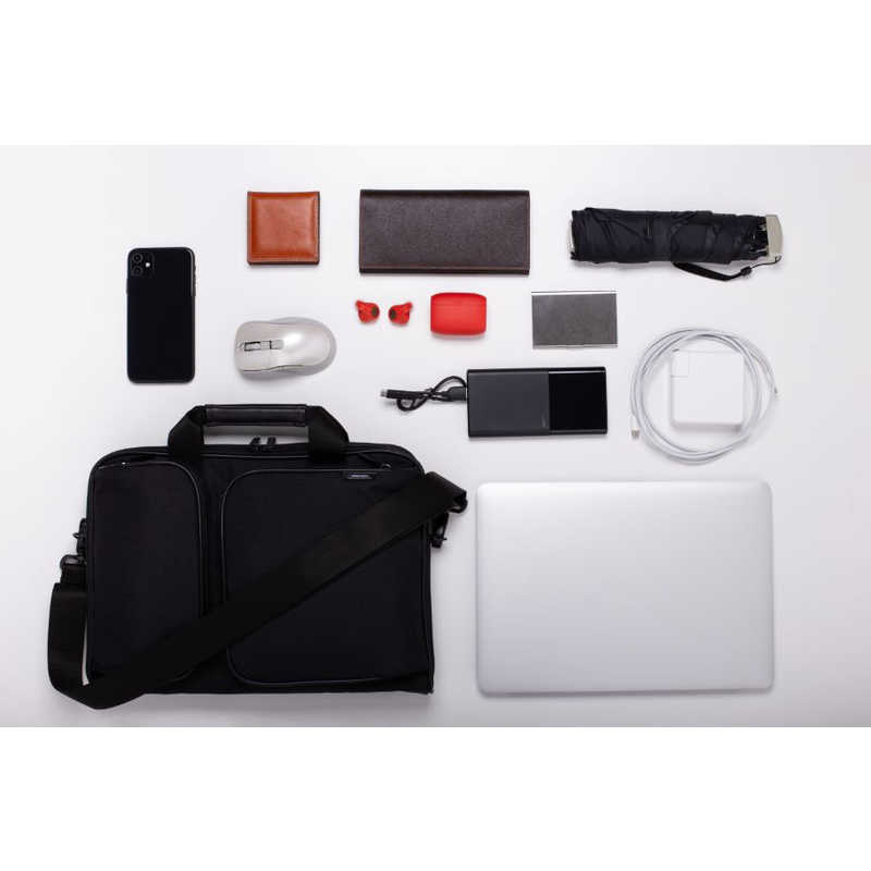 ACアダプタや小物の収納に便利なポケットと、スマートフォンやポータブルゲーム機などの収納に便利なポケット、2つのポケットを前面に装備しています。