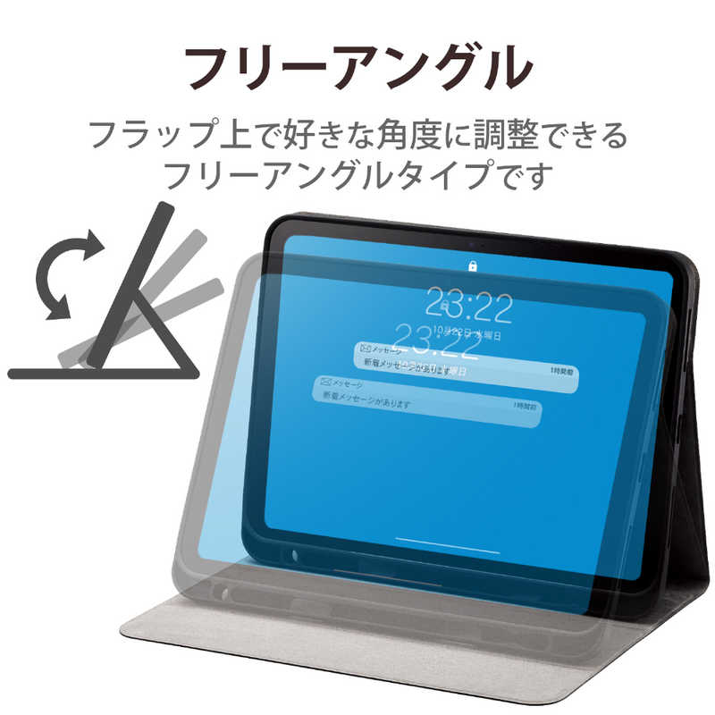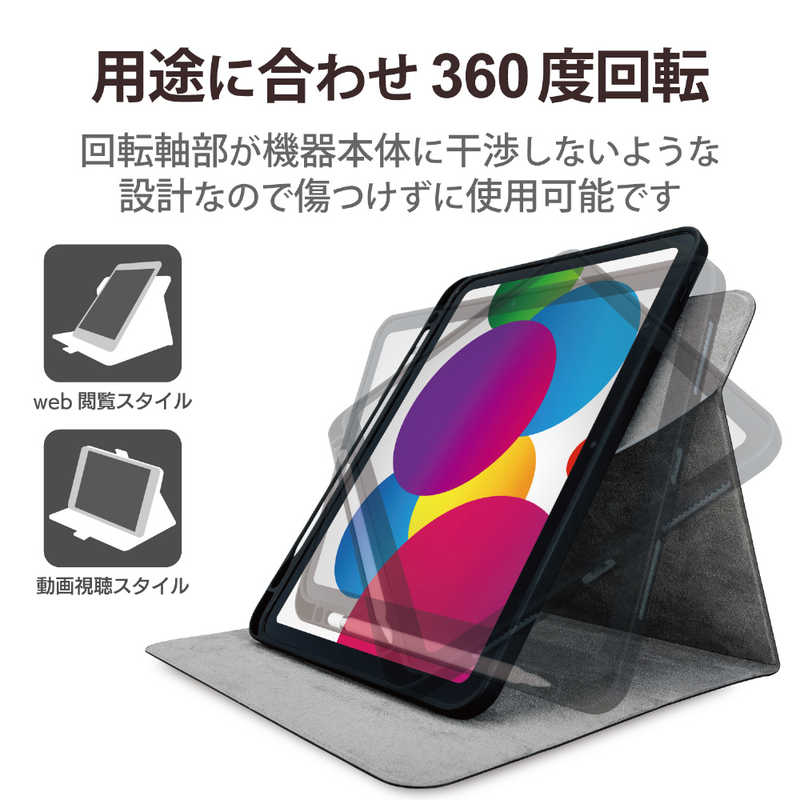 弾力性のあるTPU素材が傷と衝撃から守るiPad 第10世代(2022年モデル)用フラップケースです。360度回転でき、縦向き、横向きのお好きな角度で使用できます。