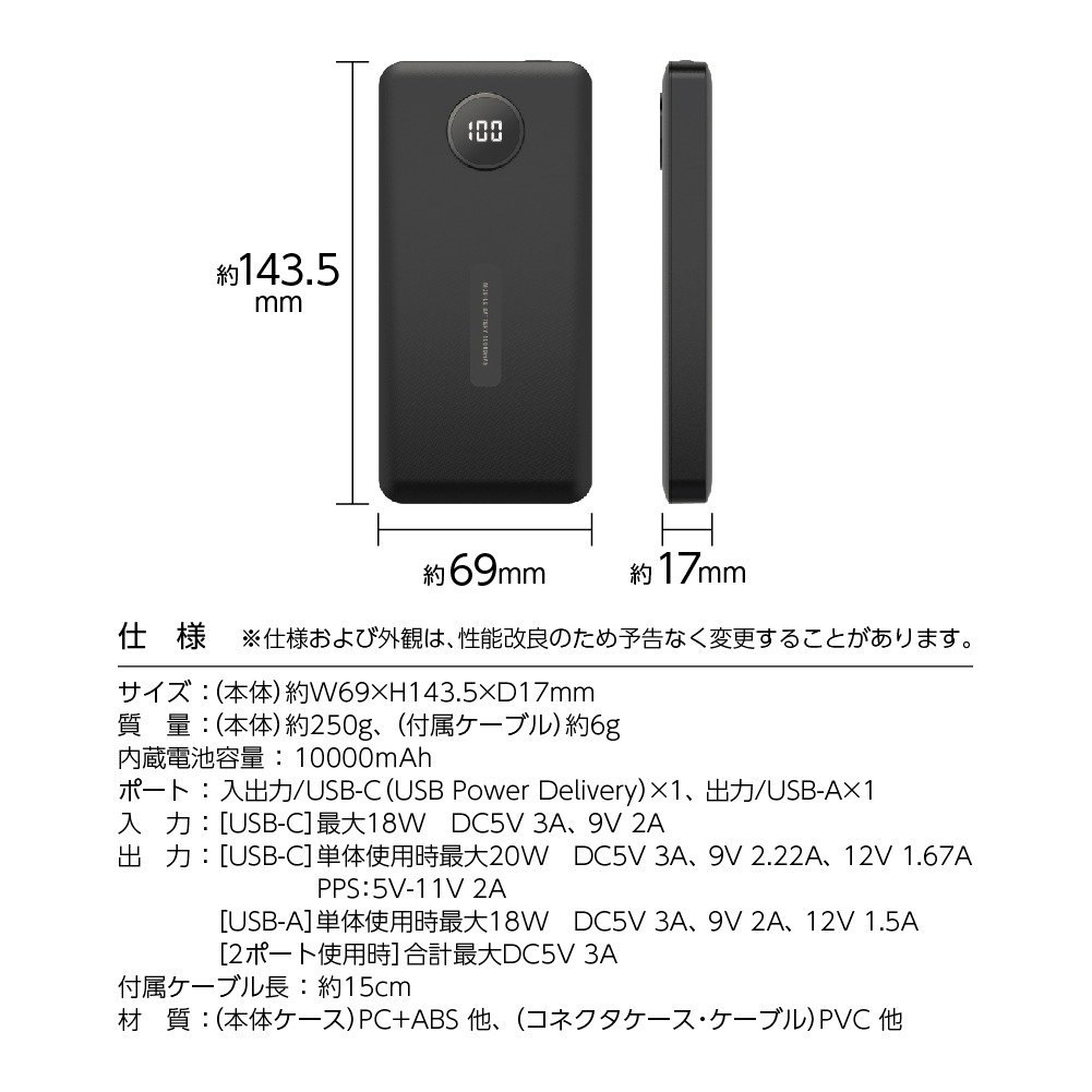 ・最大20WのUSB PD(USB Power Delivery)対応USB-Cポートと最大18WのUSB-Aポートを搭載した10000mAhモバイルバッテリーです。