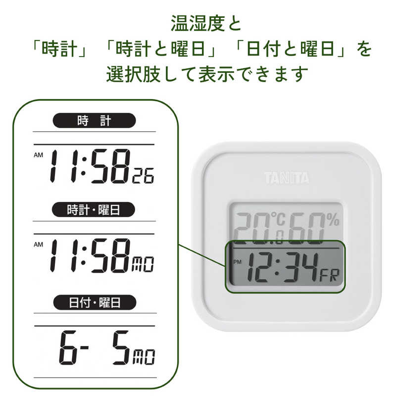見やすいデジタル表示(測定範囲)温度5.0~50.0°(5.0°未満の時、「Lo」、95%を超えると「Hi」)(測定温度)温度0.0~40.0°±1.0°、それ以外±2.0°、湿度35~75% ±5%それ以外±10%(最小)温度0.1°単位、湿度1%単位(表示周期)約20秒に1回(機能)カレンダー表示(日付・曜日)時計表示(12時間・24時間切替)最高・最低温湿度表示