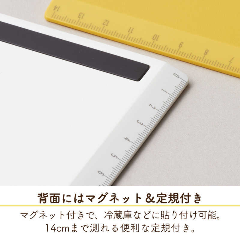 ●マグネット付きで、冷蔵庫などに貼り付け可能。14cmまで測れる便利な定規付き。