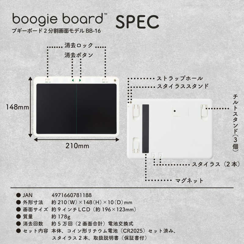 ●外形寸法:約210(W)×148(H)×10(D)mm●カラー:ホワイト●画面サイズ:約9インチLCD(約196×123mm、2画面合計)●ロック機構:あり●質量:約178g●消去回数:約5万回(2画面合計)電池交換式●電池交換:可能(CR2025コイン形リチウム電池1個)●スタイラスホルダー:あり●マグネット:付属●ストラップホール:あり●材質:ABS●セット内容:本体、コイン形リチウム電池(CR2025)セット済み、スタイラス2本、取扱説明書(保証書付)