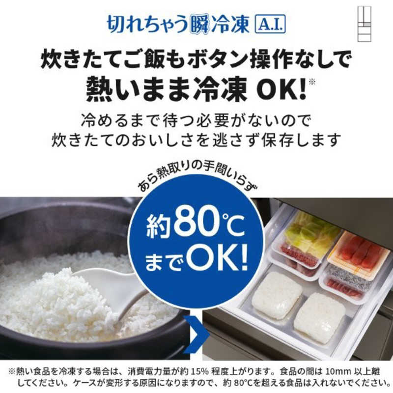 ●冷凍のお悩みを解決!切れちゃう瞬冷凍A.I.は、肉も魚もそして野菜もおいしく冷凍でき、更に冷凍なのにサクッと切れて解凍いらず!すぐ調理に使えます。
