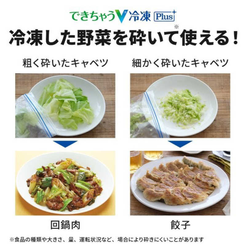●『できちゃうV冷凍』を活用すれば、形が変えられず決められたメニューでしか使えなかった冷凍野菜のお悩みを解決できます!レシピに合わせて冷凍した野菜を手で砕け、例えば、玉ねぎのみじん切り不要でハンバーグ作りもお手軽に!キャベツを手で砕くだけでヘルシーな餃子もできちゃう!これで時短調理が叶います。