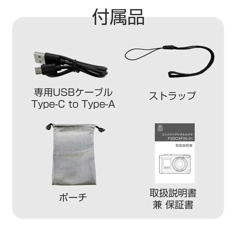 ■付属品 カメラ本体 / 充電ケーブル(USB-A to USB-C) / ストラップ / ポーチ / 取扱説明書 兼 保証書 ※充電器は別売りです。USB充電器(Type-A出力、1ポートDC5V 2A以上のもの)もしくはUSB Type-Aポートを備えたパソコンを別途ご用意ください。