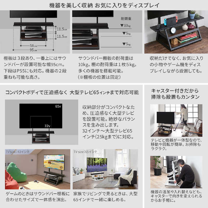 ●テレビの周辺機器をまとめて収納可能。レコーダーやサウンドバー、ゲーム機、コントローラーなどのテレビ周辺機器をまとめて収納可能。上部棚は幅95cm。サウンドバーを設置したりインテリア小物を置くのに便利。耐荷重は上段が10kg、中段・下段の棚は各5kgで合計20kgまで。