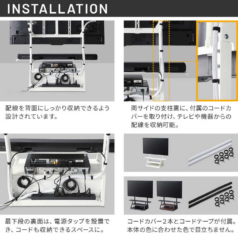 ●配線は背面に収納可能。最下段の背面に電源タップを収納できるスペースを設け配線類をまとめて収納可能。テレビの配線は付属のコードカバーでまとめて支柱の背面に固定して下段の収納スペースへ。