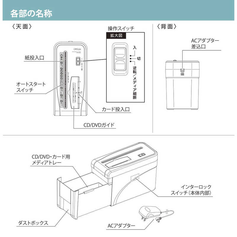 ● 梱包内容:シュレッダー本体(ダストボックス含む)、専用ACアダプター、保証書付取扱説明書
