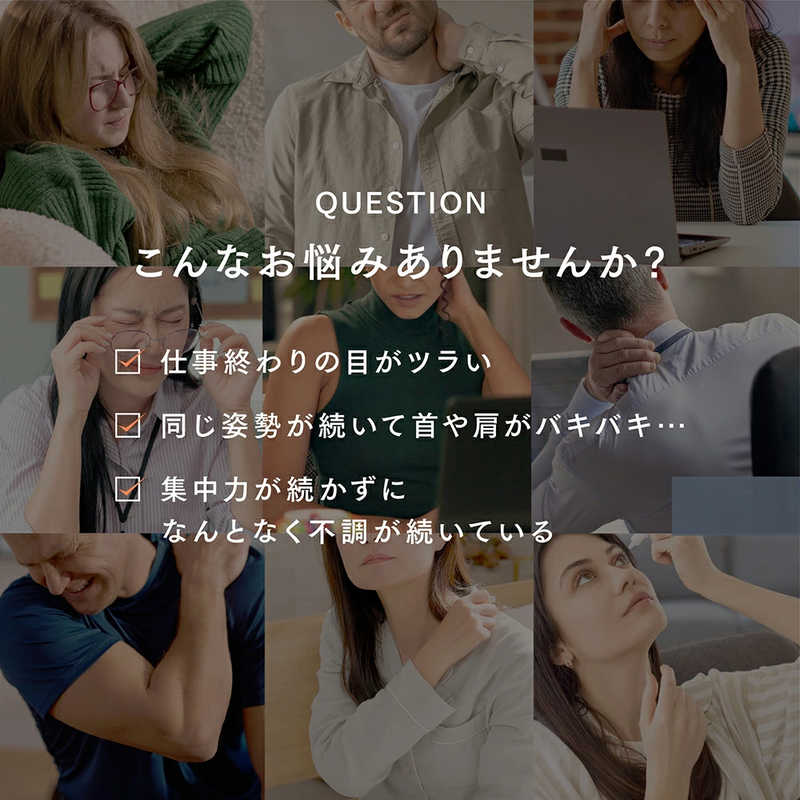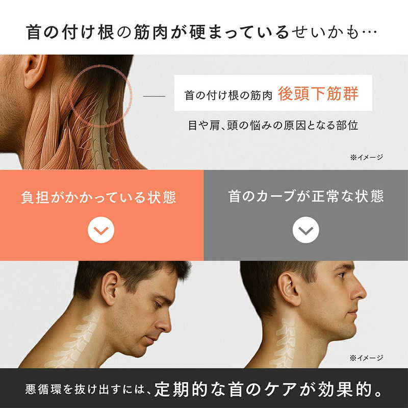 温熱×EMS×強牽引の3つの独自のアプローチで、首と目の重さの原因となる付け根を“グググ”っと解放。コードレスだからどこでもすぐにケア可能に